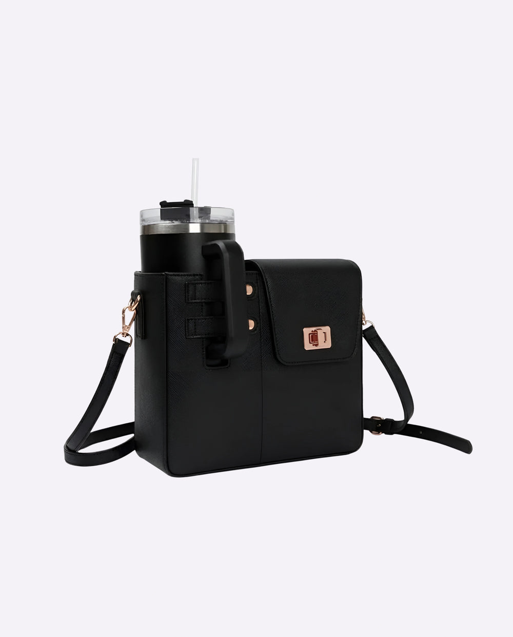 The Dual-Compartment Design: One side is a precision-engineered, insulated holder for your 40oz tumbler (compatible with Stanley, Owala, and more). The other is a structured, flap-closure handbag for your personal essentials.
